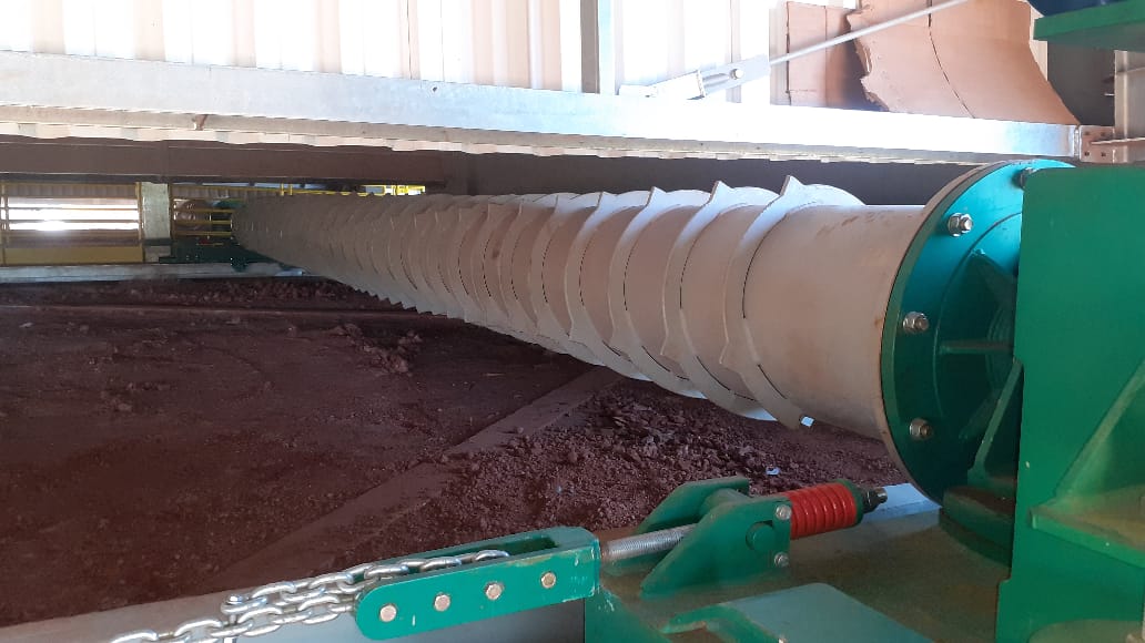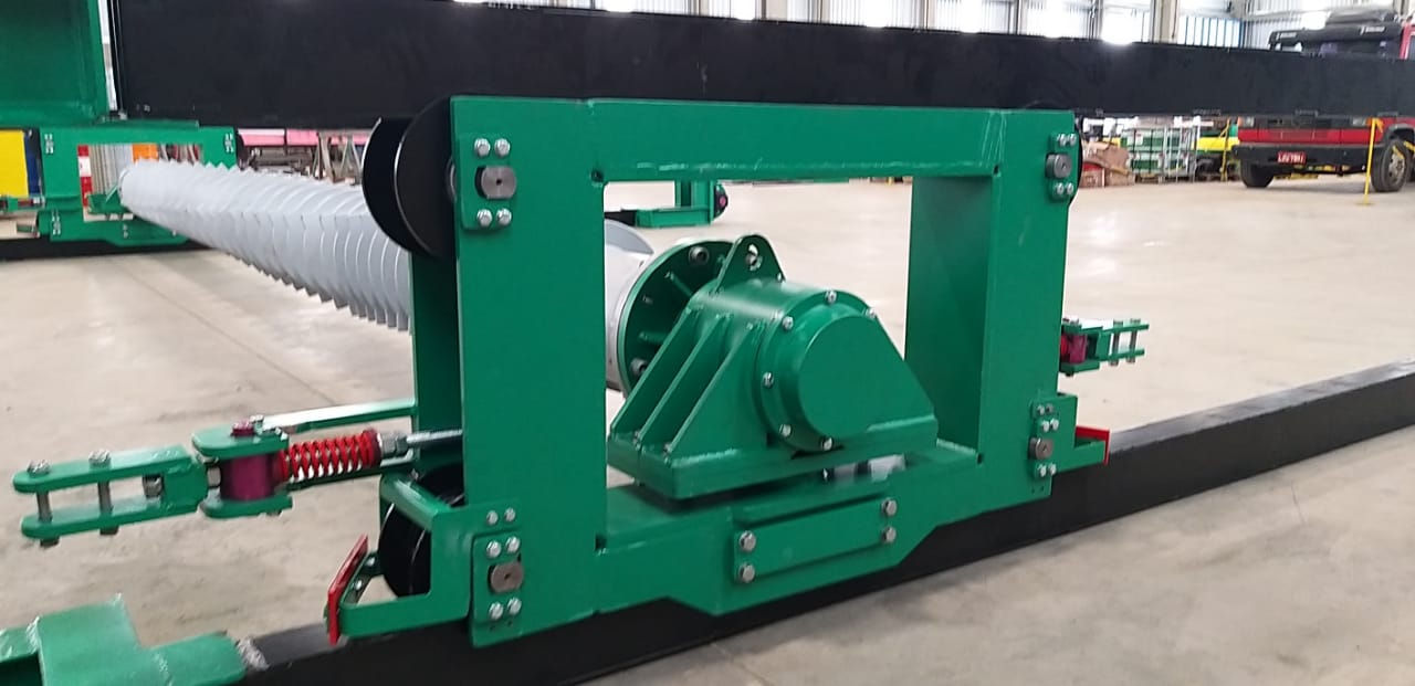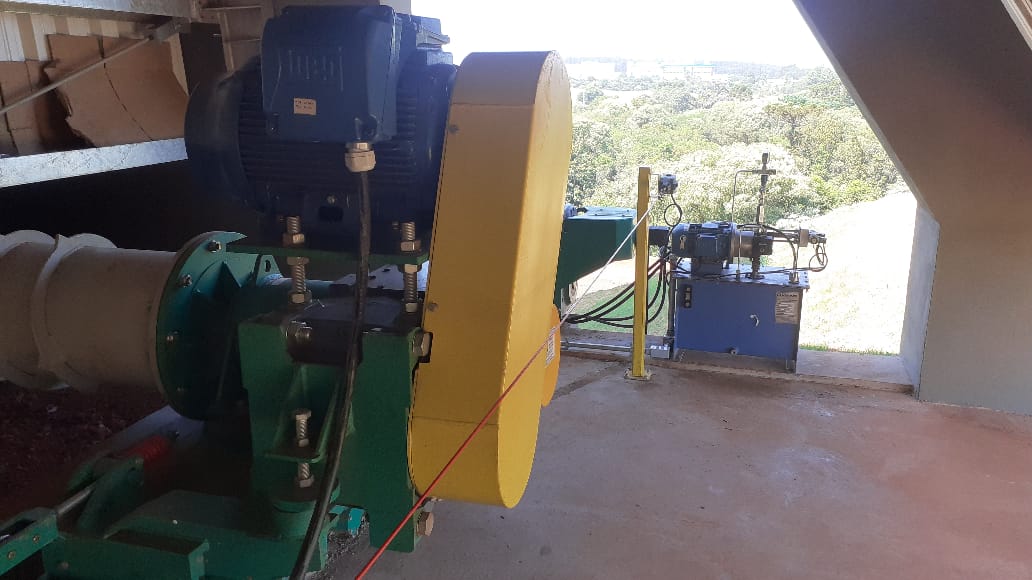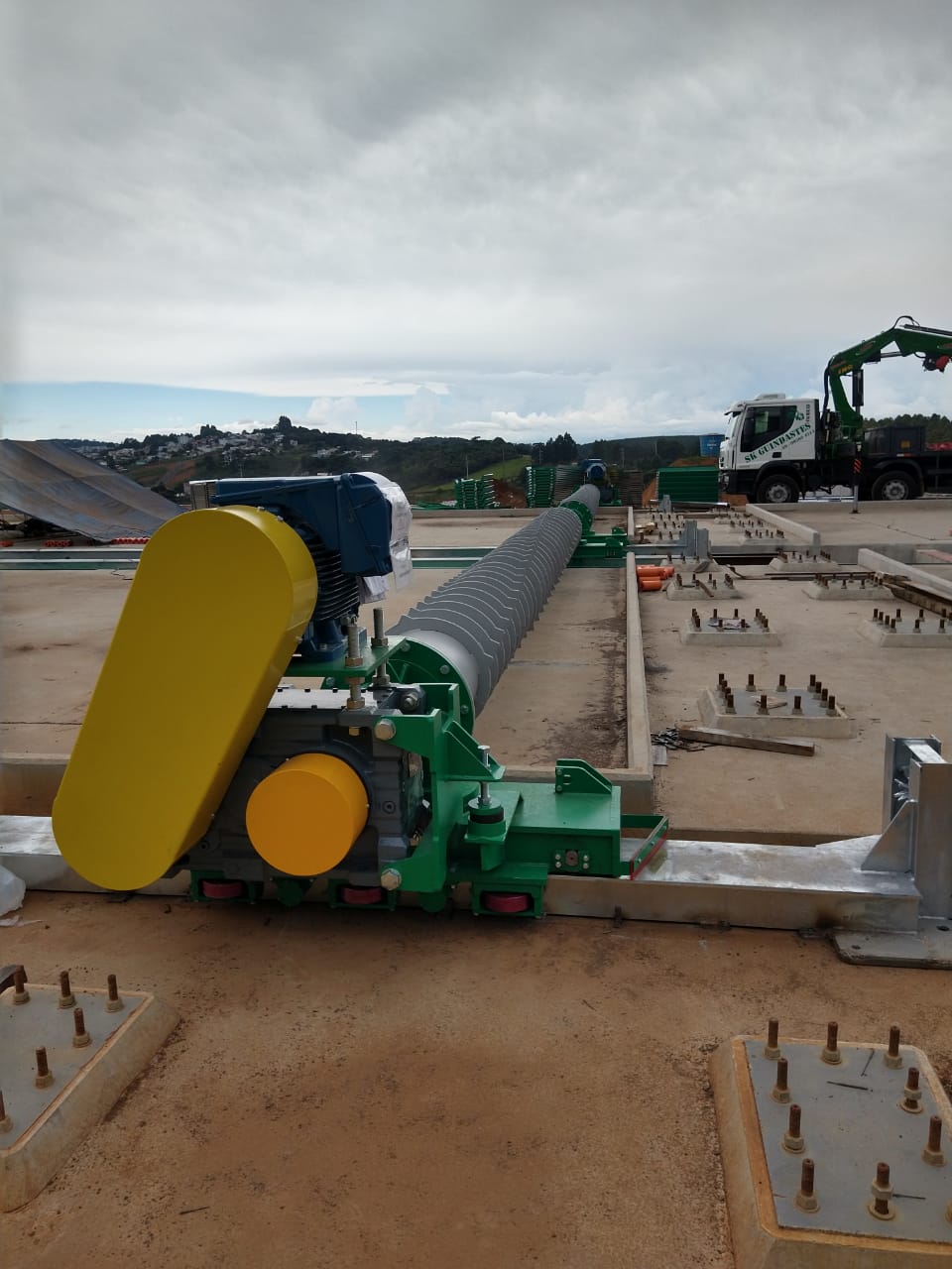 O sistema conta com acionamento hidráulico de translação, que desloca todo o conjunto da rosca varredora ao longo do trilho. Isso permite a varredura completa da rosca por todo o silo, com reversão automática do sentido de translação.