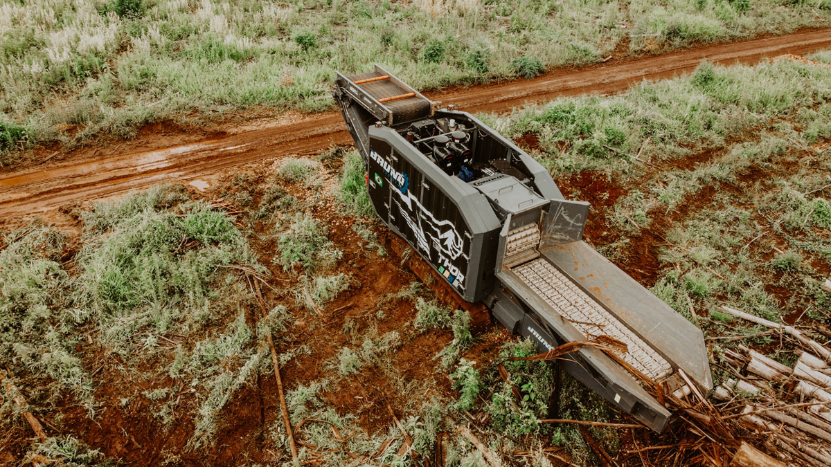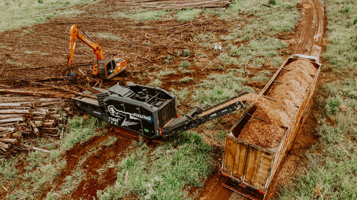 Indicado para processamento de árvores inteiras – pinus e eucaliptos –, supressão nativa, tocos, raízes e acácia, o Thor entrega alta produtividade com baixo consumo de combustível.