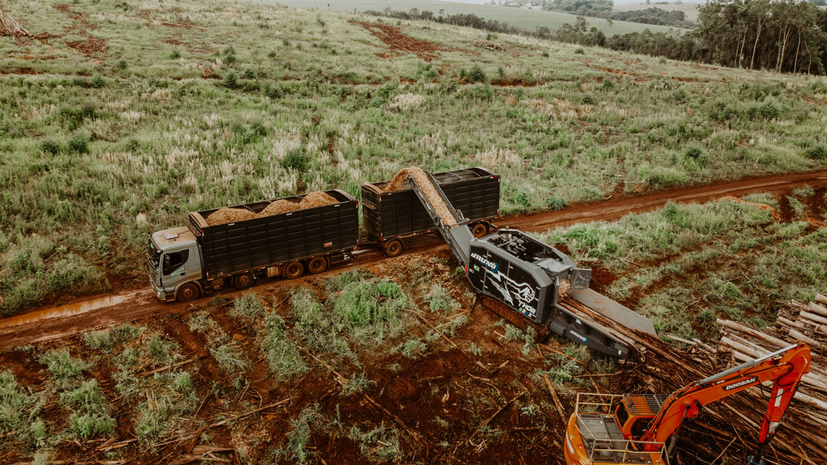 Indicado para eucalipto e pinus (árvore inteira e madeira traçada), supressão nativa, tocos e acácia, galhadas e casca.