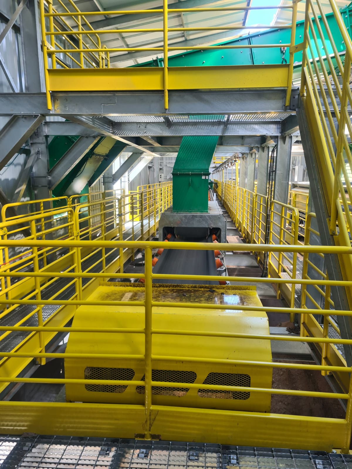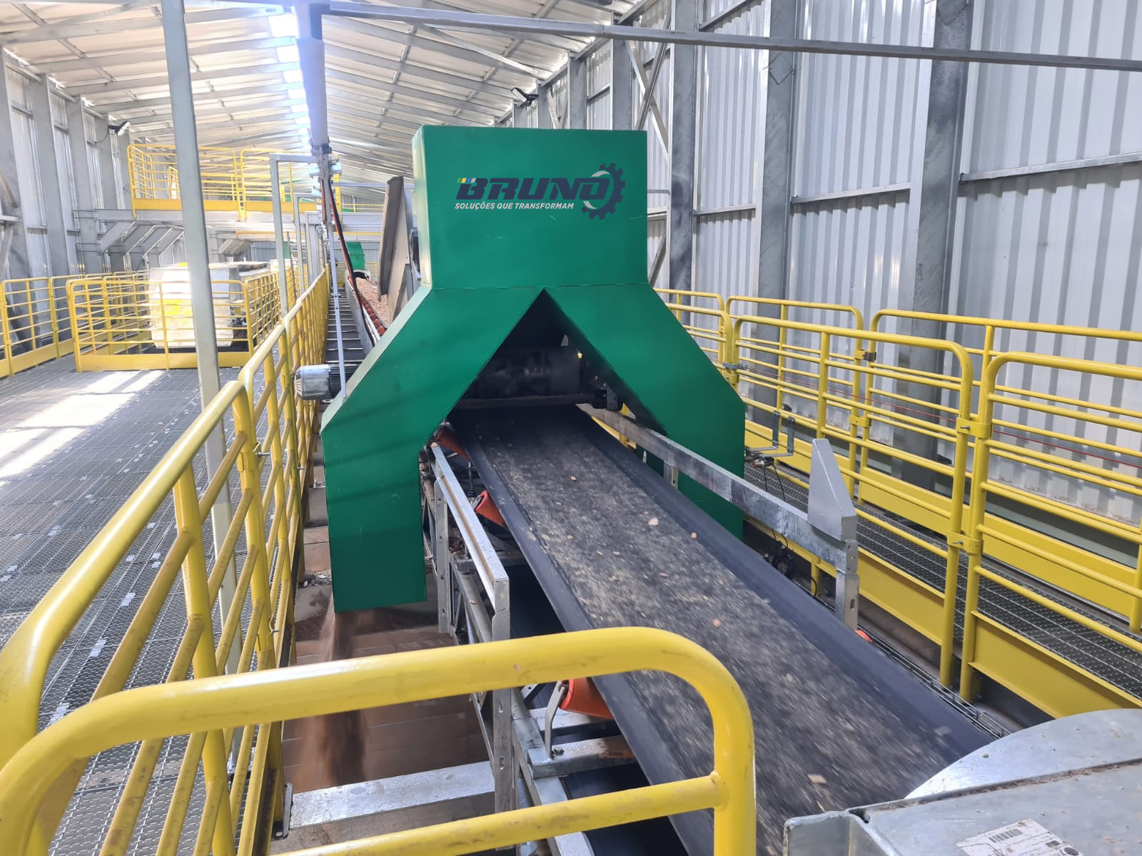 O sistema tipo tripper, montado sobre trilhos, permite o descarregamento do material em qualquer ponto ao longo da correia transportadora, garantindo uma distribuição precisa da biomassa.